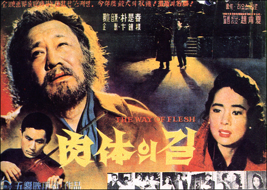 《육체의 길》 화목한 가정의 가장인 김승호는 깡패인 허장강의 앞잡이가 되어 나쁜짓을 일삼는 김지미를 동정한 나머지 그녀를 사랑하게 되고, 그녀와 함께 유랑서커스단의 일원으로 전전하다가 마침내 여자는 죽고 자신도 폐인이 되어 버립니다. 훗날 화목하던 옛집을 찾아가지만 차마 가족 앞에 나타나지 못하고 다시 정처 없는 방랑의 길을 떠납니다. 이발소에 붙어있던 이 포스터를 처음 봤을때 '육체'라는 단어에 묘한 느낌을 받은 기억이..