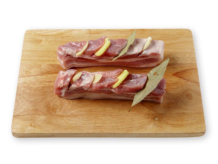 2. 통삼겹살에 칼집을 내고 칼집 사이에 생강, 마늘, 월계수 잎을 끼우고,