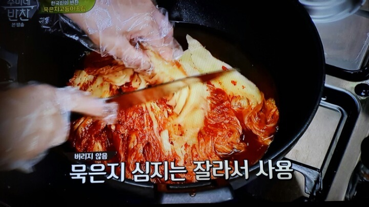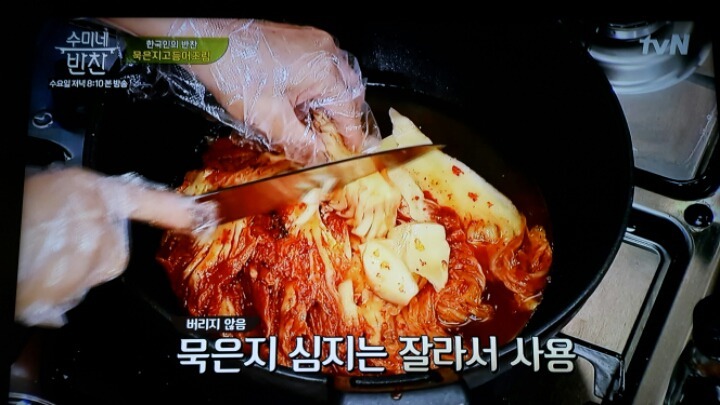 물 1컵 넣고 묵은지를 넣는다.