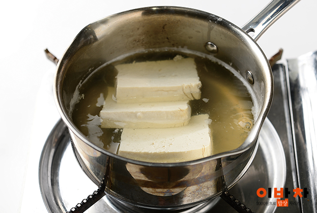 2. 두부를 도톰하게 썰어 육수에 담가 약한 불로 데우고,