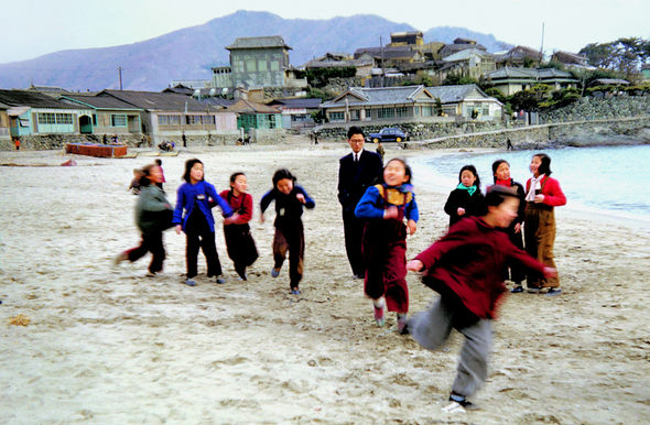 ? 바닷가 달리며 부산 송도 바닷가의 어린이들. 뒤로 적산가옥들이 보인다. 1952년 가을