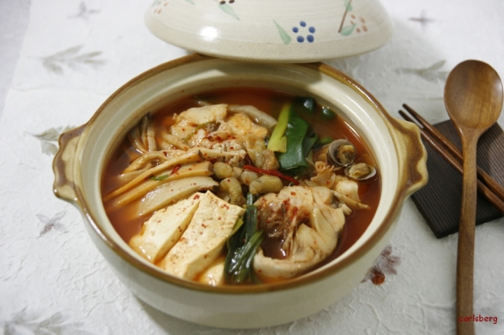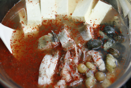 한소끔 끓인 육수에 동태와 바지락, 미더덕, 두부를 넣고