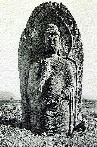 왕정곡 제2사지 석조여래입상으로 하반신이 땅에 묻혀 있다.
