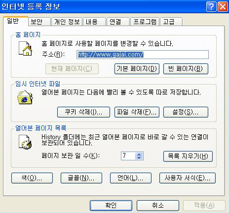 10. 인터넷 등록정보 창이 뜹니다. ① 쿠키 삭제 클릭 ⇒ 확인 클릭 ② 파일 삭제 클릭 ⇒ 오프라인 항목을 모두 삭제에 체크하신 뒤 확인 클릭 (이 2가지 작업은 적어도 일주일에 한 번 이상 하시는 것이 좋습니다. 오프라인 항목을 모두 삭제하는 작업은 다소 시간이 걸립니다. 창이 닫힐 때까지 기다리세요.)