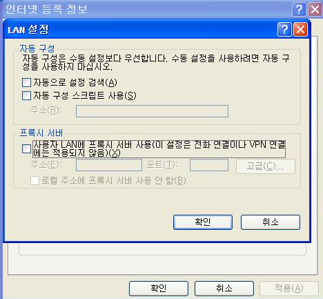 13. 연결 클릭 ⇒ LAN 설정 클릭 ⇒ 자동 구성과 프록시 서버의 체크를 모두 해제하시고 확인 클릭