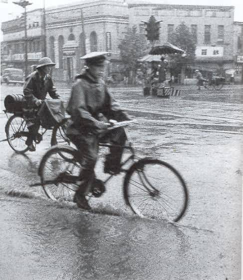 서울의 종로거리를 우중에도 배달을 위해 자전거 페달을 힘차게 밟고 가는 우체부.