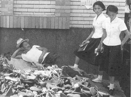 신발을 파는 노점상 주인 아저씨 표정이 느긋하다.