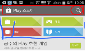 1. 스마트폰의 앱중 [PLAY 스토어①]를 클릭한 후, 검색창(②)에서 검색하고자하는 앱을 입력한 후 검색버튼을 클릭한다.(여기서는 [뮤직톡]을 검색하는 예를 들어보겠습니다)