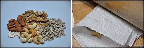 해바라기씨를 제외한 나머지를 견과류를 종이타올 사이에 넣은 뒤에 방망이로 쓱~ 밀어주면!