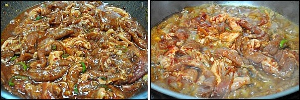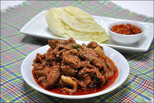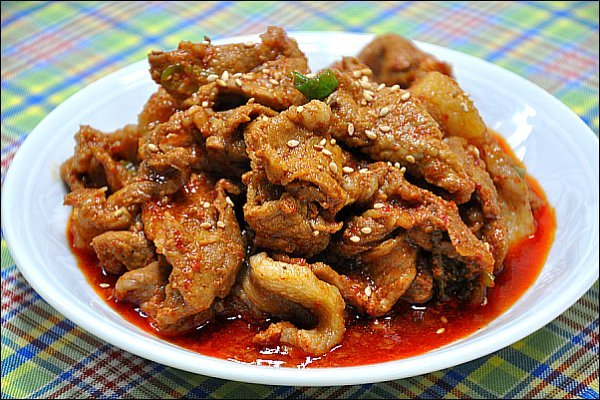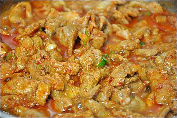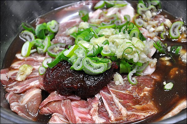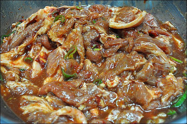 [재료] 돼지고기 650그램, 간장 3숟가락, 고추장 3숟가락, 고추가루 1숟가락반, 다진마늘 2숟가락,