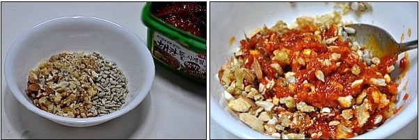 요렇게 준비한 견과류에 쌈장을 넣어주세요.