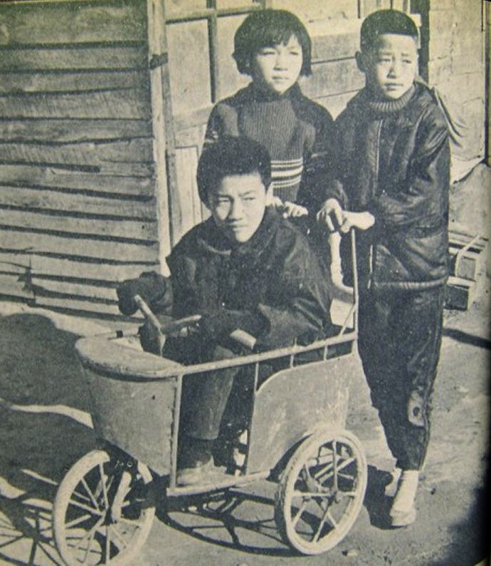 학교에 데려다 주며 돌봐주는 모습(자전거를 개조한 휠체어)