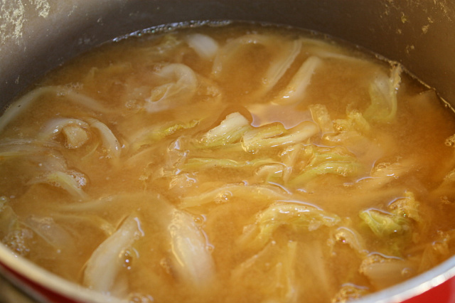 펄펄 끓어오르면 무쳐둔 배추를 넣고 함께 끓여줍니다