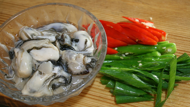 굴은 옅은 소금물에 흔들어 씻어주고, 고추, 대파는 어슷썰어 준비합니다