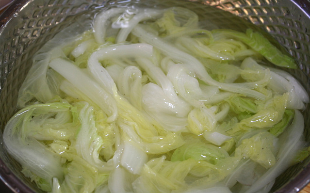 2. 데쳐낸 배추는 찬물에 헹군뒤 결대로 먹기좋게 찢어줍니다