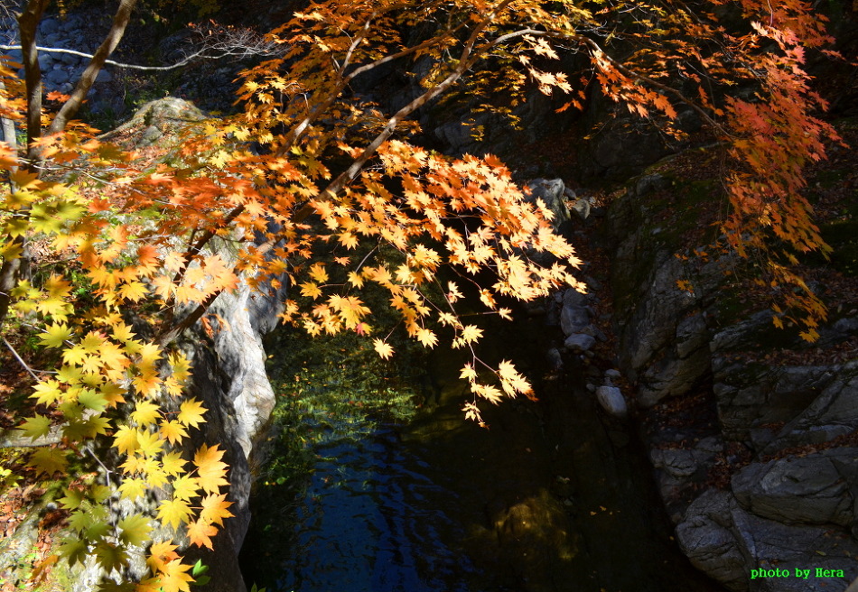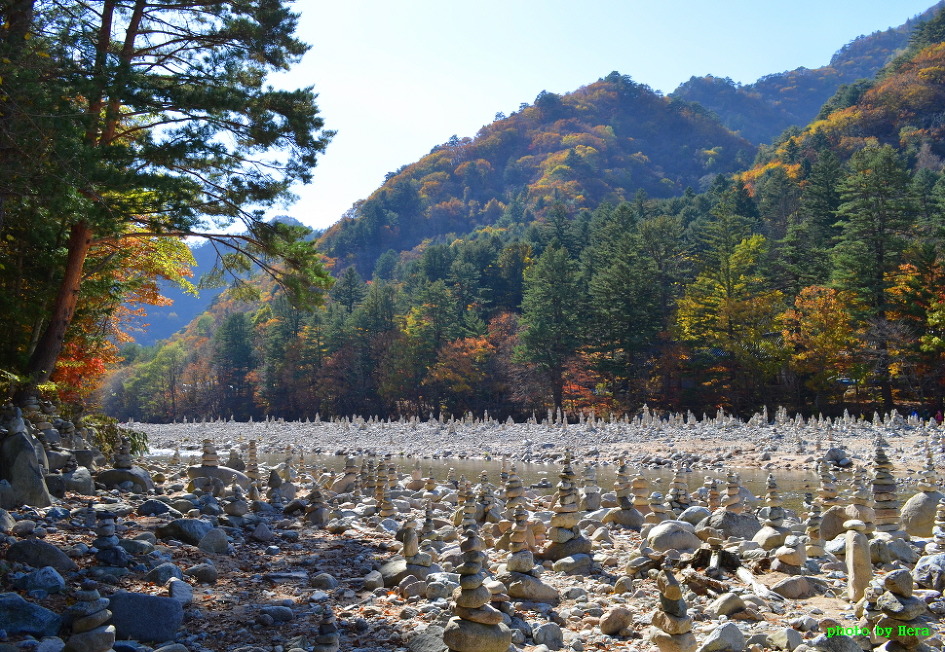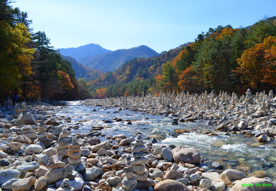 계곡에 쌓아 올린 돌탑과 단풍이 어울러져