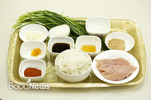 ↑ 부추 양파 닭고기 덮밥 재료. 이기태 기자 likitae@ibabynews.com ⓒ베이비뉴스