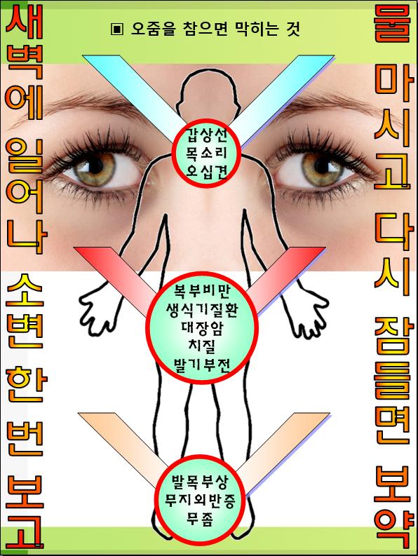 즉 요산이 방광에서 흘러나와 우리 몸 안에 들어가는 것을 방지해 주는 것이다. 그래서 물 한 컵을 자기 전에 마시고 또한 새벽에 소변을 본 다음 물 한 컵을 먹는 것은 우리 몸에 가장 좋은 보약이라는 것이다.
