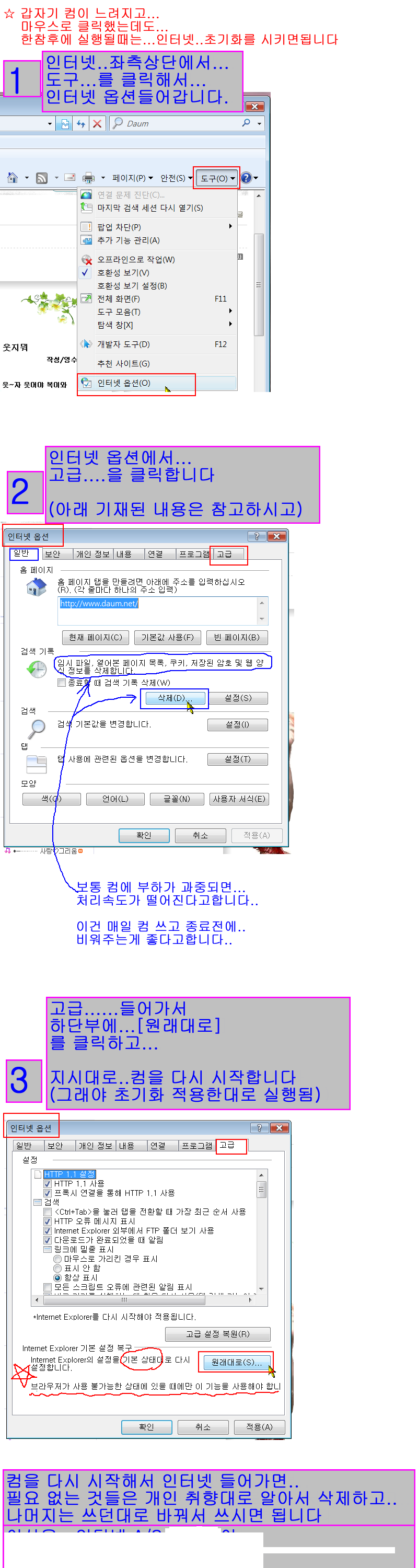 1. 위 메뉴모음에서 도구 -> 인터넷옵션 -> 검색 기록에서 -> 삭제(D)