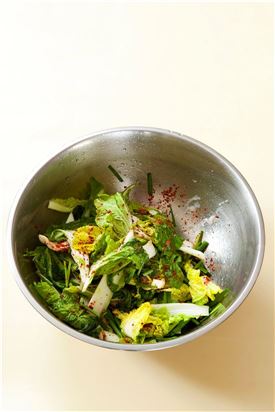 4. 볼에 솎음배추와 부추, 실파를 넣고 밀가루풀과 고춧가루를 넣어 버무린다.