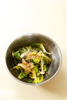 1. 솎음배추는 길이로 먹기 좋게 썰어 씻은 다음 굵은소금을 뿌려 30분 정도 절였다가 물기를 완전히 뺀다.