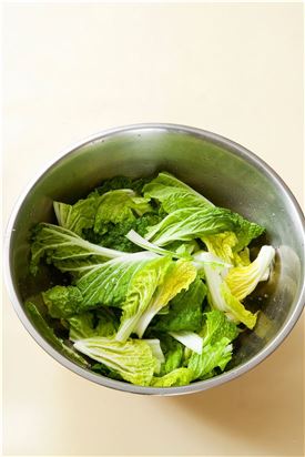 1. 솎음배추는 길이로 먹기 좋게 썰어 씻은 다음 굵은소금을 뿌려 30분 정도 절였다가 물기를 완전히 뺀다.